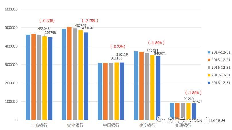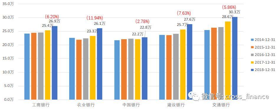 各家银行的年报数据显示,五大行的在职员工人数皆轻微下滑,工农中建交同比分别下降0.83%、2.79%、0.33%、1.89%及1.86%。而下滑幅度最大的农业银行,其人均薪酬也因此涨幅最高。不过就五大行员工基数而言,减员人数规模并不算小。