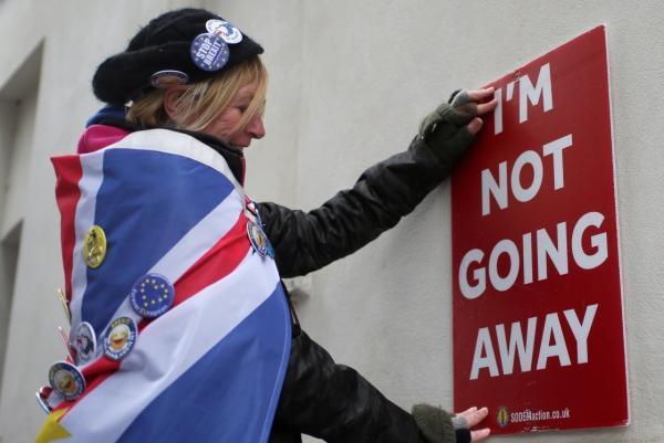 3月13日,在英国伦敦,“脱欧”反对者在议会大厦外放置标语牌。 新华社 图